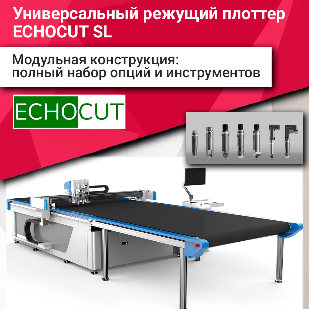 Раскройщик ECHOCUT SL оборудован алюминиевым столом с одной или двумя инструментальными вставками, позволяющими устанавливать различные инструменты. Устройство в автоматическом режиме выполняет резку, перфорацию, маркировку трикотажа, меха, искусственной кожи, джинсовой ткани, холста, хлопка и льна, ковролина, подкладочных и нетканых материалов, картона, армированного винила, вспененных материалов, резины, сотового поликарбоната, пластика, гофрокартона и других материалов.